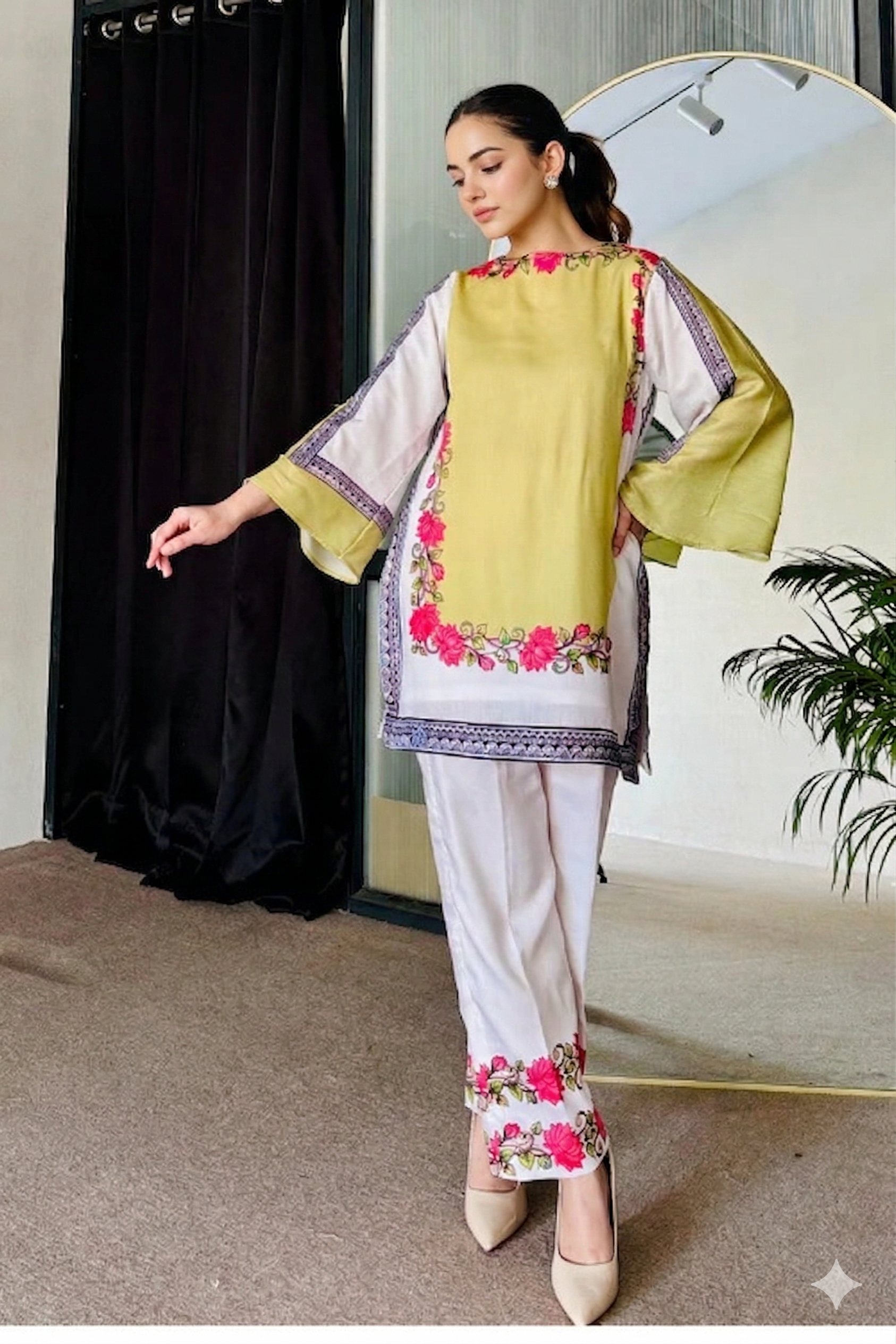 Lemon Yellow Cotton Cord-Set with Flower Digital Print